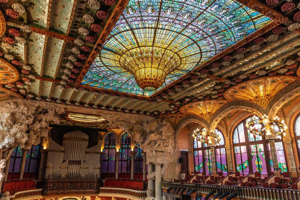 In Barcelona verzaubert der Palau de la Música mit seiner wunderschönen Buntglasdecke. Entworfen wurde dieser Konzertsaal, der zum katalanischen Modernismus zählt, von Luís Domènech i Montaner als Zuhause für den Chor «Orfeó Català». Das Glasdach in Form einer invertierten Kuppel verwandelt Sonnenlicht von oben in ein tanzendes Farbenspiel im Innenraum des Konzertsaals und lässt das gesamte Dach wirken, als würde es leuchten. Typisch für den katalanischen Modernismus, wurde bei der Motivwahl mit floralen Mustern und katalanischer Symbolik gespielt. Besonders auffällig ist, dass der Saal tagsüber beinahe ausschliesslich von Tageslicht beleuchtet wird, was zur Zeit seines Baus in keinem anderen Gebäude der Fall war.
