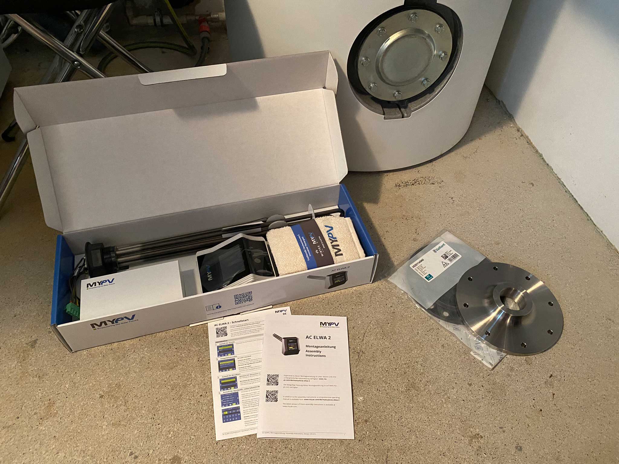 Mit dem gekauften Haus war seit 2012 schon ein Vaillant-Boiler mit 300 Litern integriert, welcher leider keinen Heizpatronenanschluss (G 1.5 Zoll) hat. Das erschwerte eine Nachrüstung mit der AC ELWA 2, die zwar in zwei Teilen geliefert wird (Heizstab und Elektronikeinheit getrennt montierbar), aber wenn der Boiler keinen passenden Anschluss für den Heizstab bietet, hilft das wenig. Hierfür wurde ein Umweg genommen, denn der Eigentümer ist von der my-PV-Lösung überzeugt.