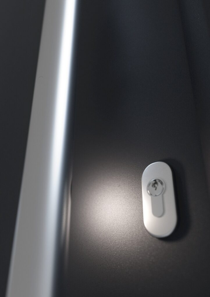Die Eingangstüren Thermo46 sind neu optional mit einem selbstverriegelnden Schloss erhältlich. Beim Schliessen der Tür aktiviert der integrierte Mechanismus automatisch die Mehrfachverriegelung – eine manuelle Schlüsseldrehung ist nicht erforderlich.
