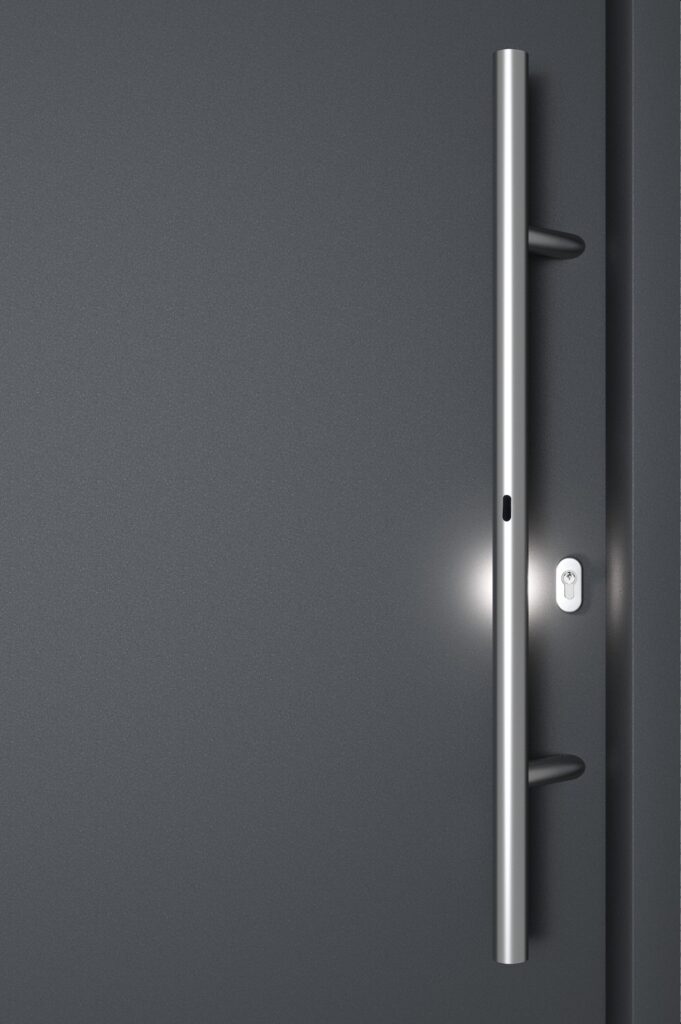 Der neue Stangengriff mit integrierter LED-Beleuchtung für Thermo65 Haustüren verbessert die Orientierung bei Dunkelheit. Ein batteriebetriebener Bewegungsmelder mit Dämmerungssensor aktiviert die Beleuchtung automatisch, sobald sich eine Person der Tür nähert. Das Türschloss wird für 15 Sekunden ausgeleuchtet und erleichtert so das Öffnen und Schliessen erheblich.